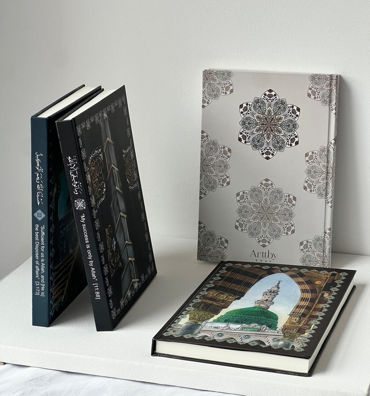 A unique collection of A5 notebooks featuring digital prints of our hand-painted artworks, Islamic quotes on the spine, and Islamic-inspired patterns on the back.